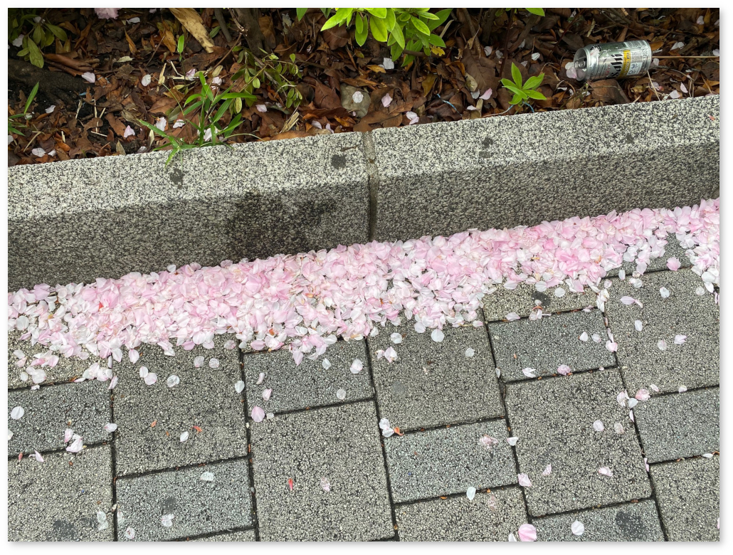散歩中に、八重桜が盛んに散っていて、花びら溜まりがあるのを見た。