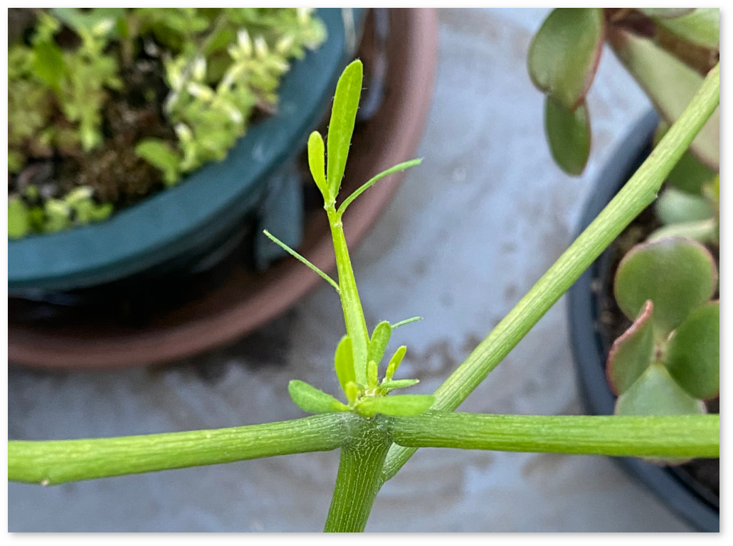 水に浸けておいたときから伸びてきていたが、ミルクブッシュはもう新芽を出して小さな葉を付けている。