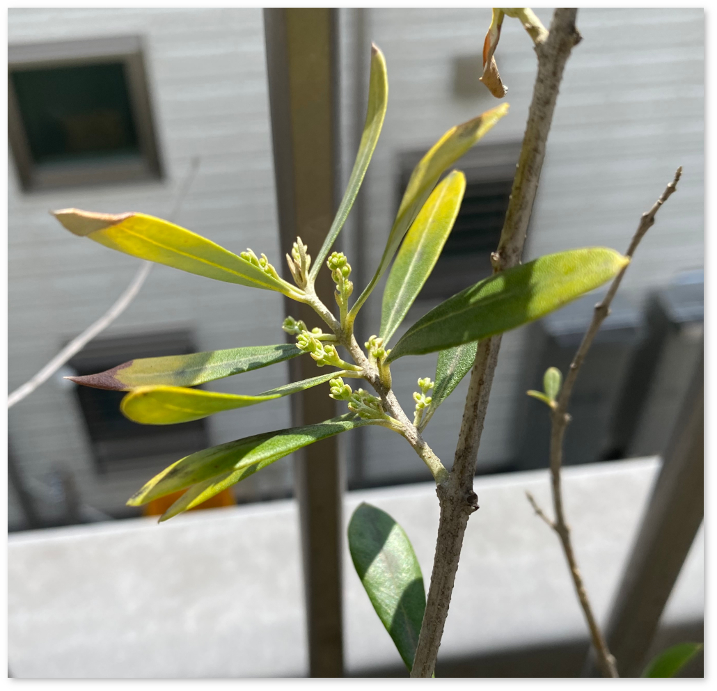 オリーブは2種類ないと実をつけないといわれていたので、2種類を1つの鉢に植えてある。