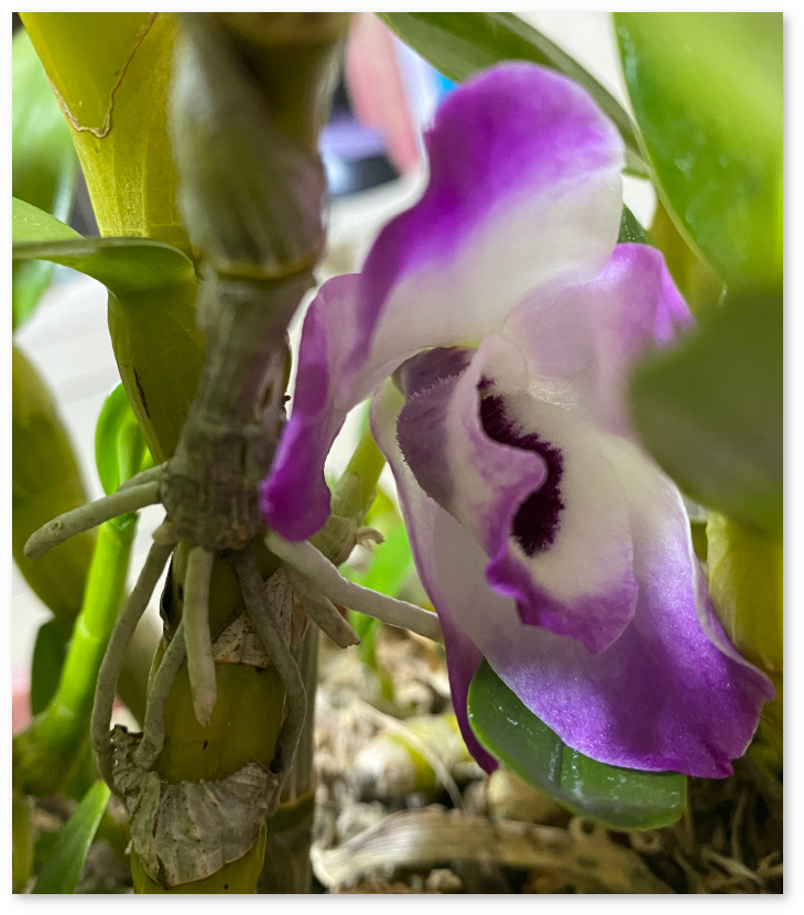 窓際の水苔プランタのデンドロビウムが1輪咲いた。