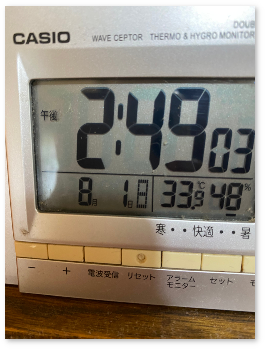この写真を撮ってからしばらくして冷房を始めた。湿度は比較的低めなので、過ごしやすく感じるがあまり我慢しないほうがいいだろう。