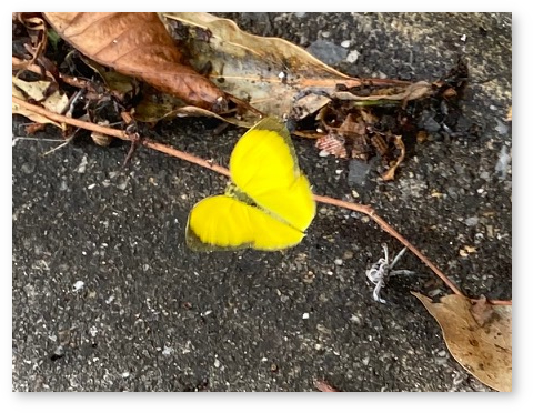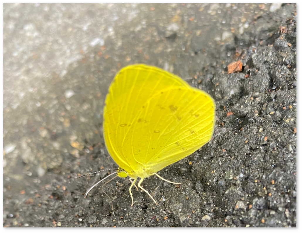 朝の散歩で、モンキチョウがひらひら道で舞っているのに遭遇したので、しゃがんでスマホで数枚撮った。