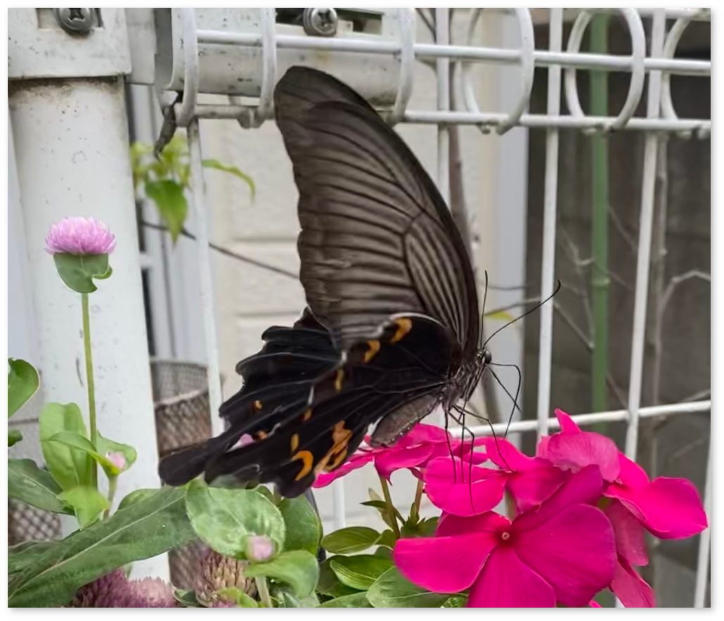今日はチョウの写真がよく撮れる日で、とくに珍しくアゲハチョウがウチの近くを舞っていたのを近くで撮ることができた。