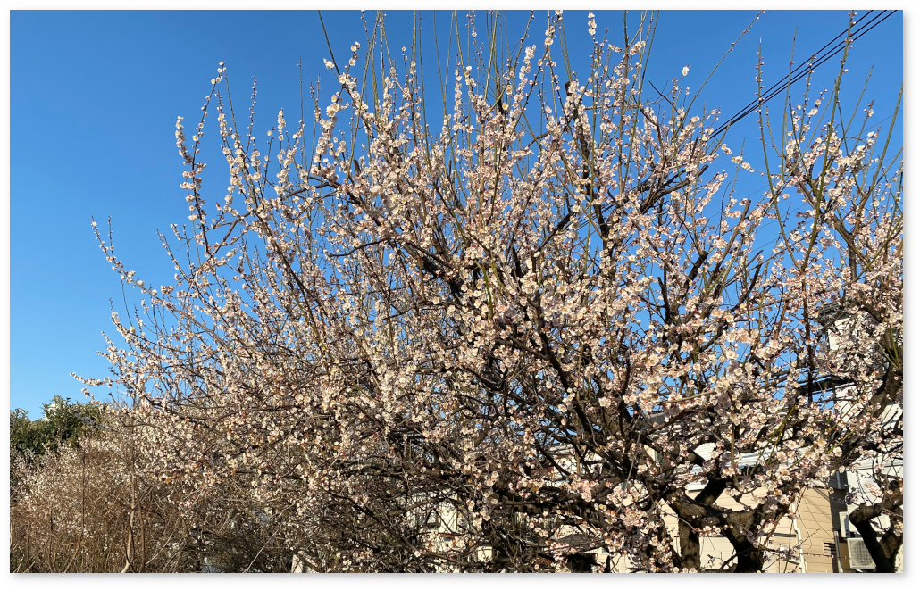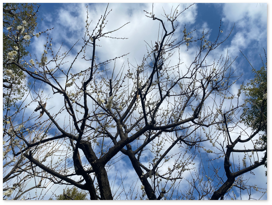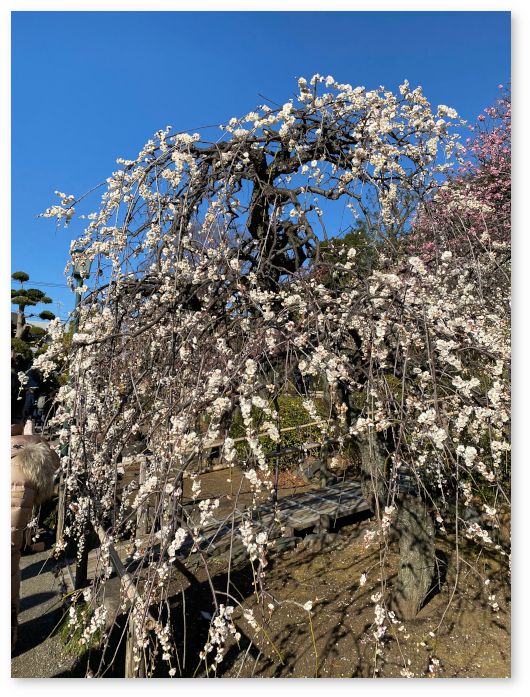 I saw Ikegami Plum Garden on TV and thought it was beautiful, so I decided to go there for a visit. It was a small plum garden built on a sloping terrain. Various plum trees with different colors of flowers, as well as drooping branches, were planted there, and it was bustling with visitors.