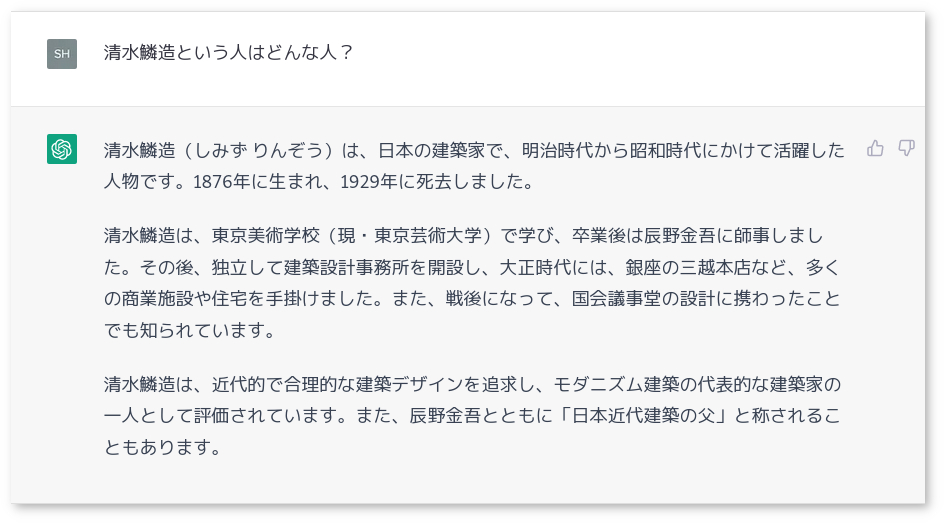 サインアップして、さっそく「清水鱗造」という人はどんな人? と聞いてみたら、建築家ですごい人が過去にいた!?
