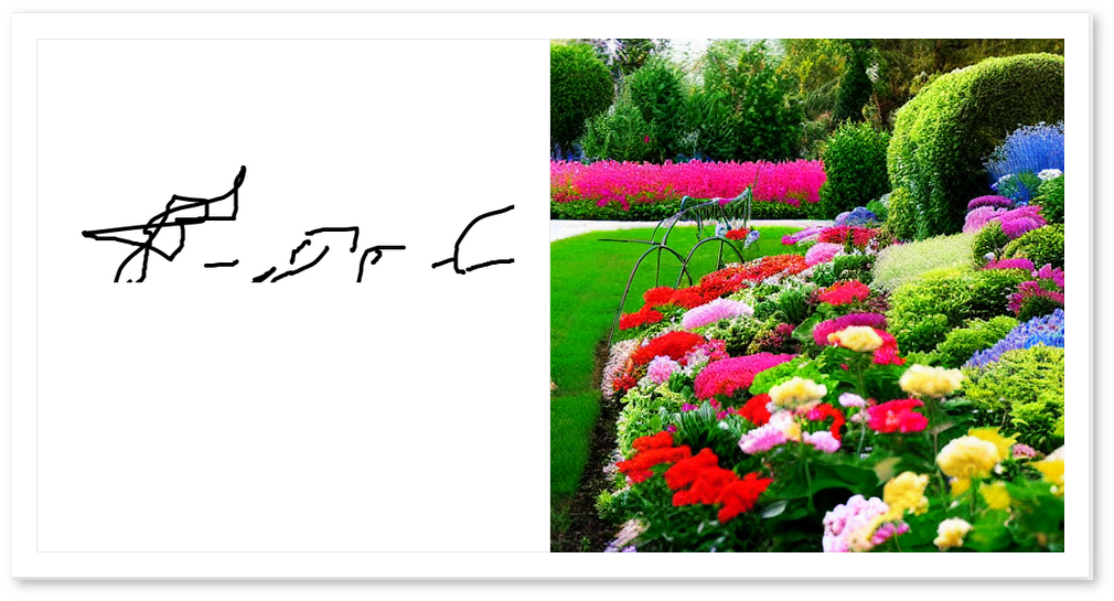 そのまま生成してできた画像。「a flower garden」ということでやってみた。