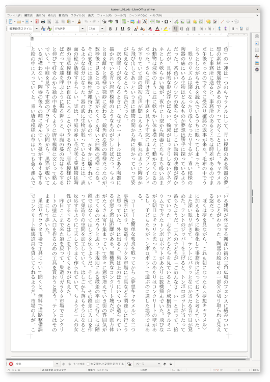 いつもLibreOffice Writerで縦組みで書いている。下のように2段組みにして、この1ページで400字詰め原稿用紙4枚が入るようにしてある。