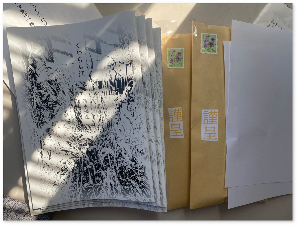 It was discovered that the small booklet of photographs and poetry, titled "Guwaran Cave," could be sent in the largest standard postal envelope for within 50g, at a cost of 94 yen. Upon obtaining the envelopes through mail order, they were approximately 3.5 yen each, so I bought 100 of them in advance.