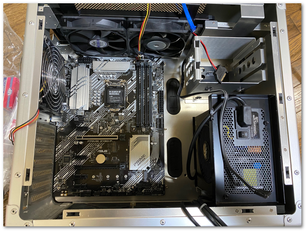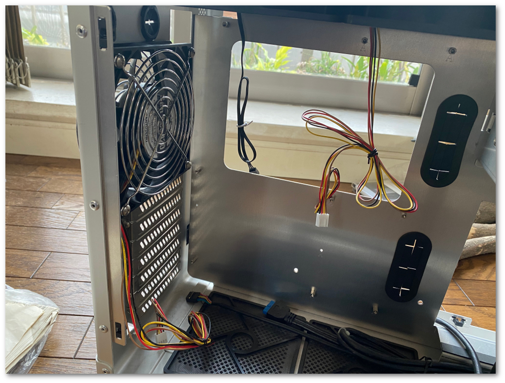 このケースは隅々までよく設計されていて、電源ユニットは前方に付けるようになっているが、ケーブルを引き回して後ろ側にコネクタが出るようになっている。