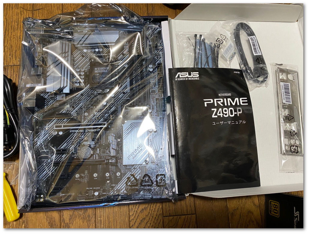 明日は写真のマザーボード上にCPU、メモリ、グラフィックカードと取り付ける。